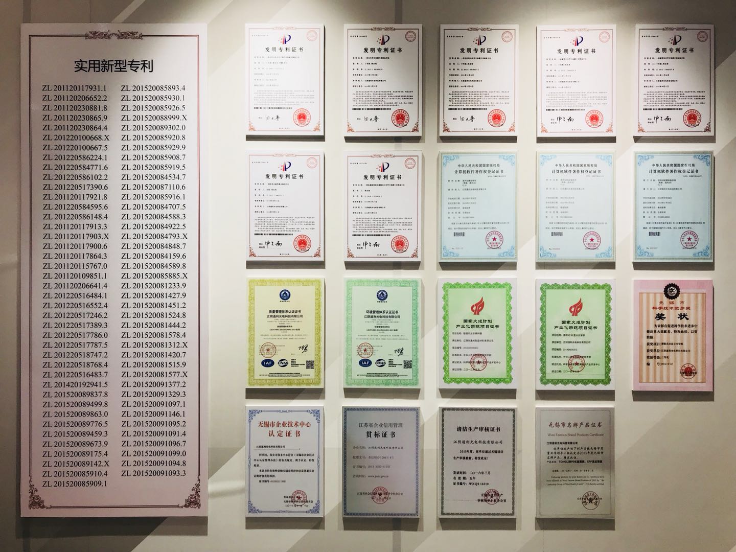對(duì)工藝改進(jìn)的執(zhí)著探索和對(duì)產(chǎn)品質(zhì)量的極高要求不但為通利科技帶來(lái)了強(qiáng)大的市場(chǎng)競(jìng)爭(zhēng)力,同時(shí)也獲得了市場(chǎng)的肯定,獲得了國(guó)家相關(guān)部門(mén)的認(rèn)可。通利科技現(xiàn)擁有“發(fā)明專利”、“國(guó)家重點(diǎn)新產(chǎn)品”、“科學(xué)技術(shù)成果”、“軟件著作權(quán)”等榮譽(yù),功能性新材料中多項(xiàng)產(chǎn)品被評(píng)為江蘇省“高新技術(shù)產(chǎn)品”,并被列入“國(guó)家火炬計(jì)劃”,2015年公司被評(píng)為“江蘇省高新技術(shù)企業(yè)”。